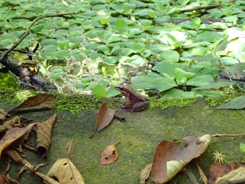 天氣轉涼之後,許多動物紛紛躲起來,連要叫聲都不太容易聽到,這時候拉都希氏赤蛙還是經常在外面趴趴走,雖說牠們的繁殖期主要集中在春、秋季,但除非過於寒冷或炎熱的極端天氣,牠們幾乎整年都可以繁殖,此時常常可以看到好幾十隻聚集在一起的壯觀場面。木屋教室的後面的水池經常能聽到牠們此起彼落的鳴叫著,這裡是拉都希氏赤蛙的大本營,在直徑約三公尺的水面上,隨便就可以數超過15隻。雄蛙的前臂肌肉特別發達,比上肢還要粗壯許多,這是為了可以緊緊抱住身形比自己還大的雌蛙。在競爭激烈的情場,為了把握住每個繁衍後代的機會,經常發生抱錯對象的糗事:抱到另外一隻同樣在挑老婆的雄蛙、不同種類的蛙、甚至是屍體……有時候一隻青蛙抱上了另一隻,附近的情敵們也會撲上來不分青紅皂白的跟著抱緊!不過愛得太熱烈,有時候還會因為抱得太緊而將對方不小心勒死。