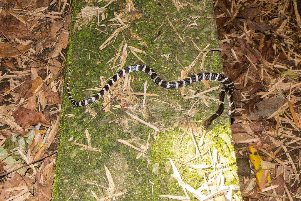 雨傘節算是個人在野外觀察中發現最多次的毒蛇,一身黑白相間的紋路,非常好辨識,但有時不小心會將白梅花蛇誤認成雨傘節。雨傘節成蛇頭部全黑,身上的白色環紋較黑色細,且紋路較平整,不像白梅花蛇的條紋周圍呈現鋸齒狀,且多半會帶有一些灰黑的顏色參雜其中。