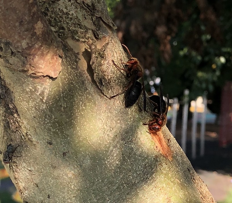 說了這麼多可怕的攻擊模式,但其實也有很多時候是可以好好觀察牠們的,譬如說台灣的特有種光蠟樹上,樹幹灰白色的樹皮中含有大量汁液,是許多昆蟲補充養份的來源,其中當然也包含了虎頭蜂。光蠟樹在成長時每年都會不斷脫皮,樹皮很容易撐破,因此常常可以在光蠟樹上看到大量虎頭蜂、獨角仙、蝴蝶分食,就像是共享餐桌一樣,這時就是可以靜靜觀察牠們的好時機。