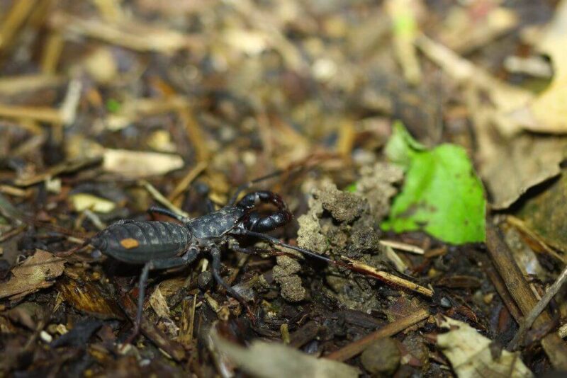 在四月底工作假期行動,配合螢火蟲季節晚上安排夜間觀察活動。為求保險在活動開始前幾天我便約了一些人並且找了溯溪認識的生態高手KK陪我一同夜探自然谷。夜觀過程中一路上拍蟲、翻葉。在刻意放慢腳步的狀況下看到了不少東西。就在轉過怪手夾時,KK猛然定步,彎下腰在邊坡的枯木背後抓出了一隻長得像蠍子的生物。「哇!是鞭蠍耶,你眼力也太好了吧!」我驚呼看著眼前的小東西。驚訝是因為鞭蠍在平常不算常見,不是因為數量少,而是因為他晝伏夜出的習性,再加上生性隱蔽且黑色的鎧甲巧妙的跟週遭的夜色融合,因此不留神很容易就會錯過他。將其輕放回地上,鞭蠍一落地馬上就高高舉起他的橢圓型的大屁股,這是他受到威脅時會呈現的標準動作。KK開始一邊拍照,一邊替同行的其它伙伴講解這隻有趣的生物:「長尾鞭蠍名字中有個蠍字,長得又跟我們印象中的蠍子很像,但實際上他跟蠍子的血緣關係頗遠,在台灣本土蠍子種類很少,大部份在南部較易發現,目前僅有八重山蠍以及東亞茄蠍及樹皮蠍有發現的記錄。」