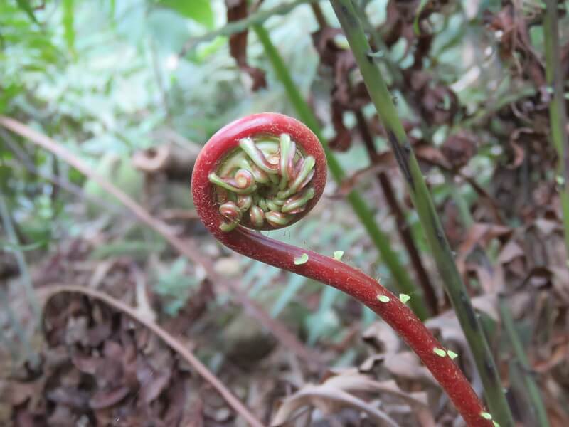 一般對於蕨類的印象,其葉子大多是綠色,除了會有些深淺的色澤區別。走在自然谷山路旁,不時會發現像問號般帶著紅色的蕨類幼葉,其姿態之美讓人無法忽視,後來一問之下才知道,原來是烏毛蕨的幼葉。烏毛蕨科的幼葉,都會呈現暗紅色,表面還會帶有油亮的光澤(感覺好像很好吃XD)。而慢慢展開後的羽葉,初期葉緣泛紅並在陽光的照射下,油亮又有點透光的綠葉帶著暗紅色澤,真的讓人感到被療癒。目前已知烏毛蕨科全世界有8屬180~230種,台灣則有3屬11種,所占世界烏毛蕨科種數6%。