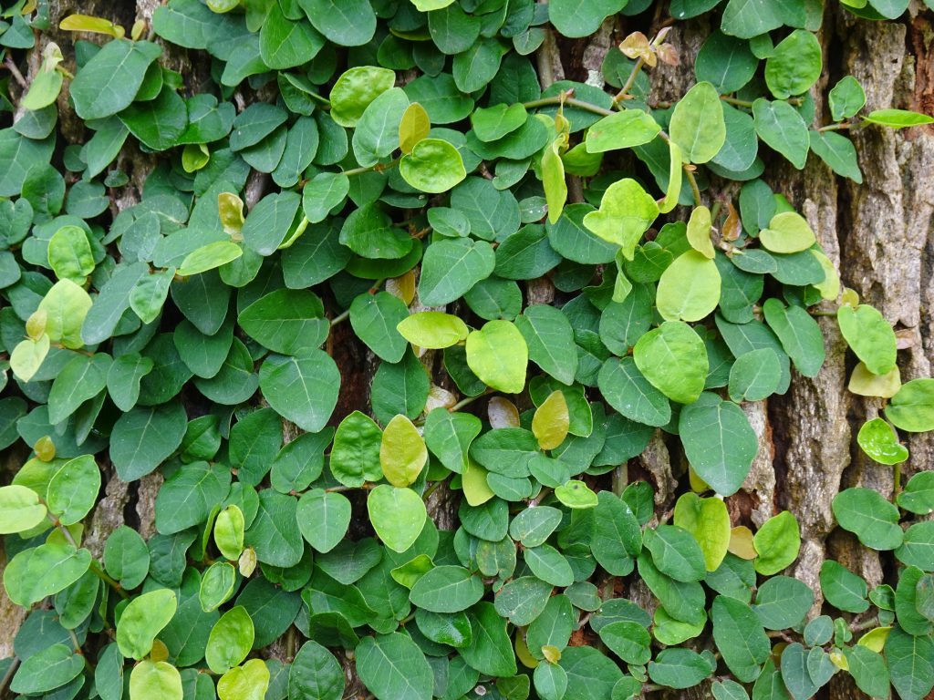 我是在花市認識薜荔(讀音同必力)的,但那時它叫做「霹靂」,種在小小的三吋盆裡,垂掛在牆上展售。或許因為它的本名常讓人念錯,店家才取了個響亮的綽號。不過,當我跟它變熟之後,發現它的風格確實挺「霹靂」:生命力強,能一路爬到天涯海角,無論是老屋磚牆、水泥河堤,還是三層樓高的樟樹,隨處都能見到薜荔的身影。