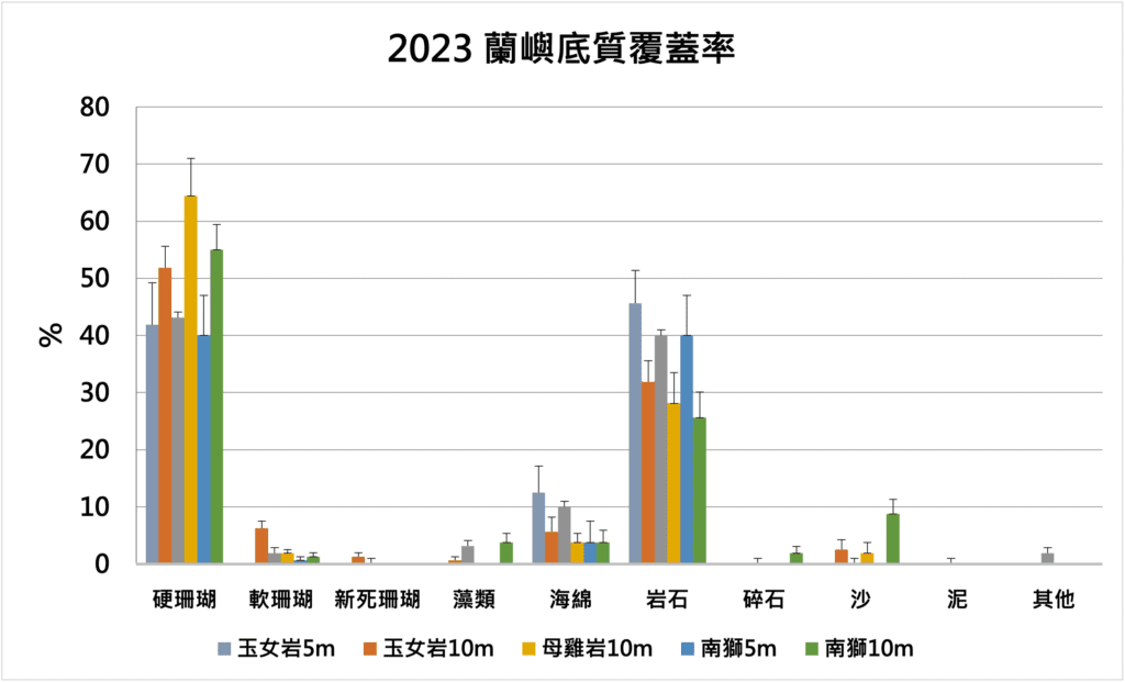 其它非生物類別的底質則以岩石為主,覆蓋度介於25.6~45.7%,最高為玉女岩5米處,最低為南獅10米處。三個調查點的10米處皆有零星的沙粒分佈,介於1.9~8.8%,南獅10米處最高。