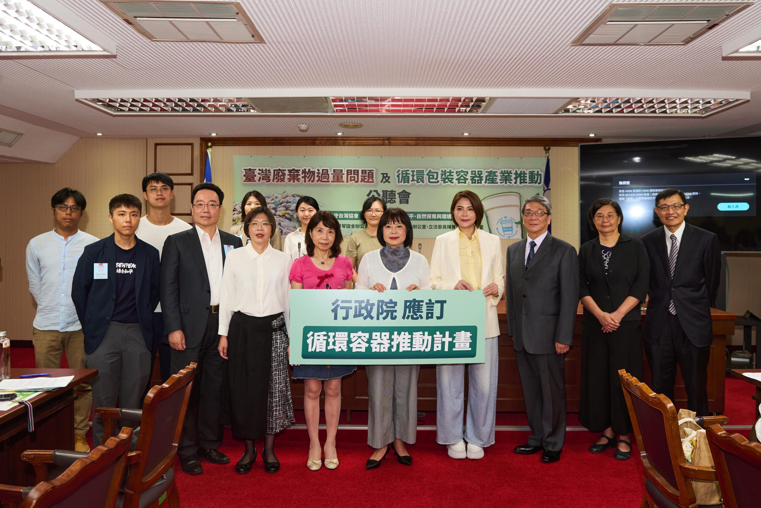 自然保育及環境資訊基金會及綠色和平、看守台灣協會、荒野保護協會,於立法院共同召開「臺灣廢棄物過量問題及循環包裝容器產業推動公聽會」,討論循環包裝容器產業發展所需之政策與法令,呼籲行政院應主責指導跨部會共擬「循環包裝容器推動計畫」並設置專門預算,加速循環包裝容器成為臺灣社會淨零、減塑減廢的關鍵解決方案。